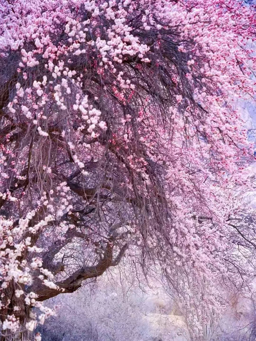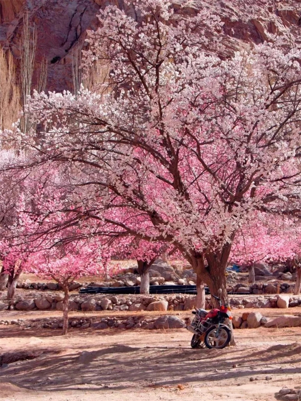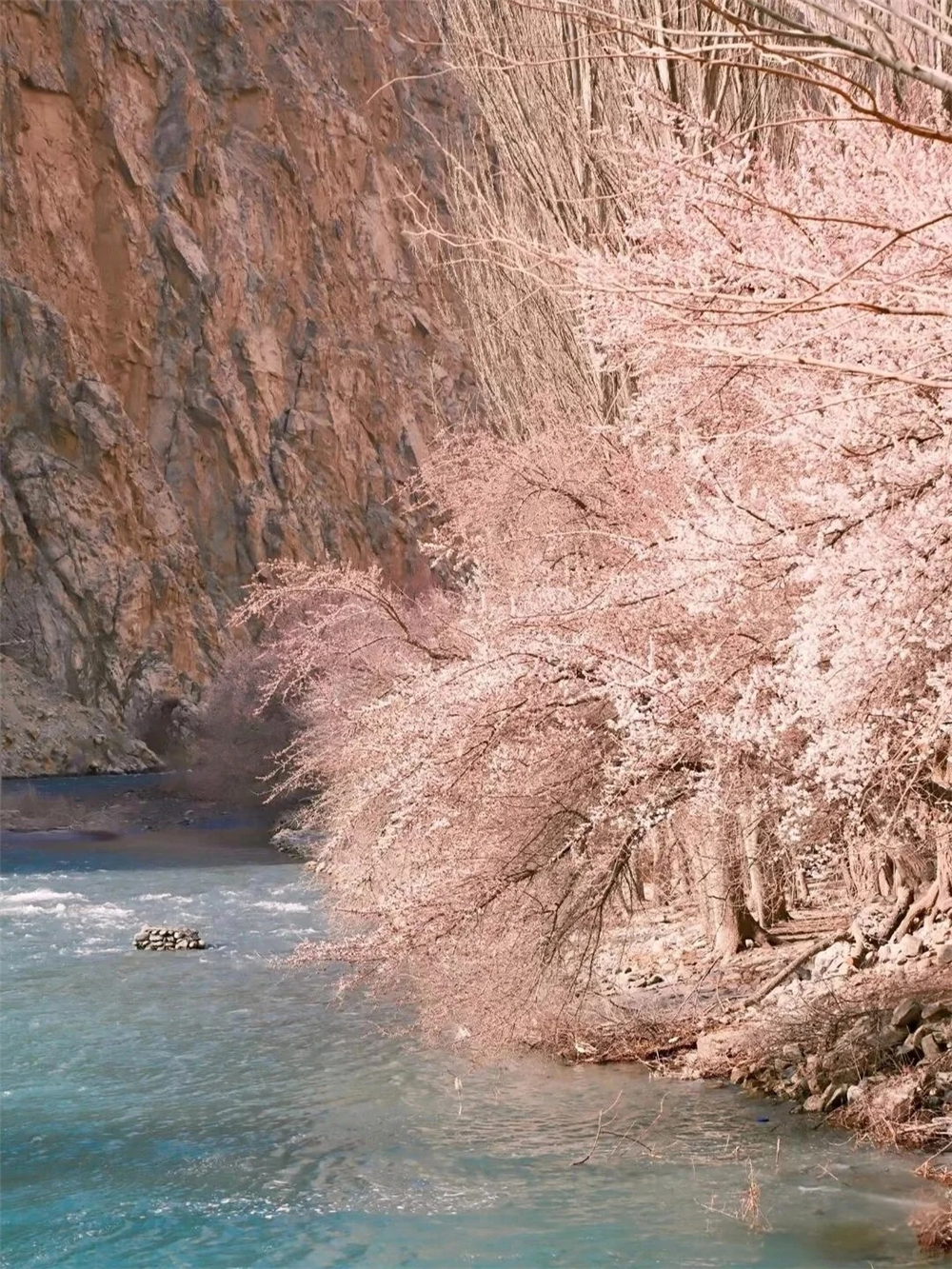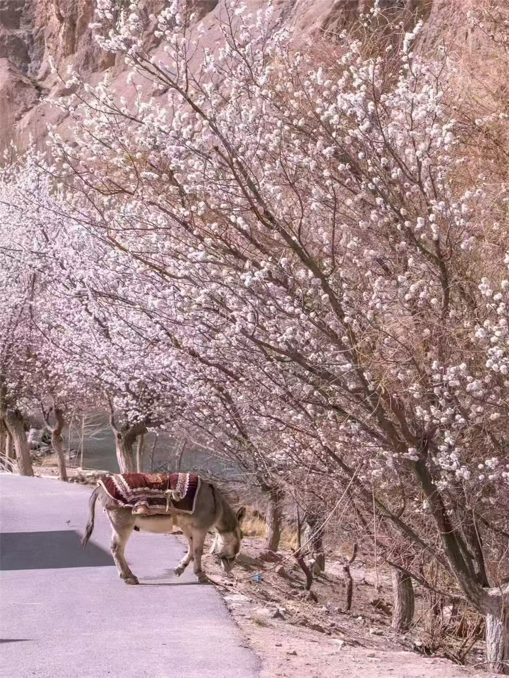 随后前往【库科西鲁克】-杏花吹满头,道路两边,成片的杏花树。后来越往深处,杏花次第绽放,红的,粉的,白的,一树树的花开迷了眼。【塔尔乡幸福五号桥】库克西鲁克塔尔乡杏花村,位于昆仑大峡谷里的“塔莎古道”路旁。“塔莎古道”连接塔什库什尔干县和莎车县,经过阿克陶县塔尔乡、恰尔隆乡,相传为唐玄奘取经东归路,昆仑山巍峨险峻,雪山融水清流激荡,高原杏花姹紫嫣红,塔吉克族风情浓郁,杏花的花期较短,每年从花开到花谢只有18天左右的时间,错过就要等明年咯,晚上入住塔尔乡民宿。