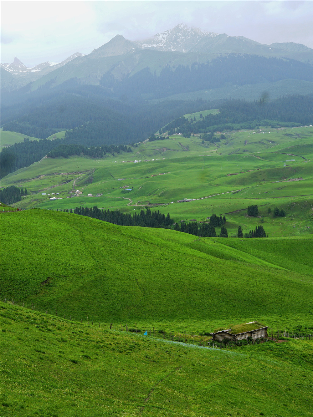 早上起来,喝碗地道的哈萨克奶茶,配着酥软的包尔萨克和酥油,一顿营养早餐就完美解决了。我们可以在毡房附近的草地上来一场淋漓畅快的山地越野晨跑,然后前往万纳服务区,这里有一个草原牧民世代使用的洗羊池,运气好的话,可以看到大尾羊集体沐浴的场景。从这里开始,我们徒步前往喀拉峻老门票站(东门),这是一条牧民转场的牧道,沿途经常可以遭遇大量的牛羊或在悠闲的觅食,或在匆忙的赶路,为尽快抵达下一片草场而前行着。中午在草原花海中路餐,下午乘车前往云杉小镇—库尔德宁。