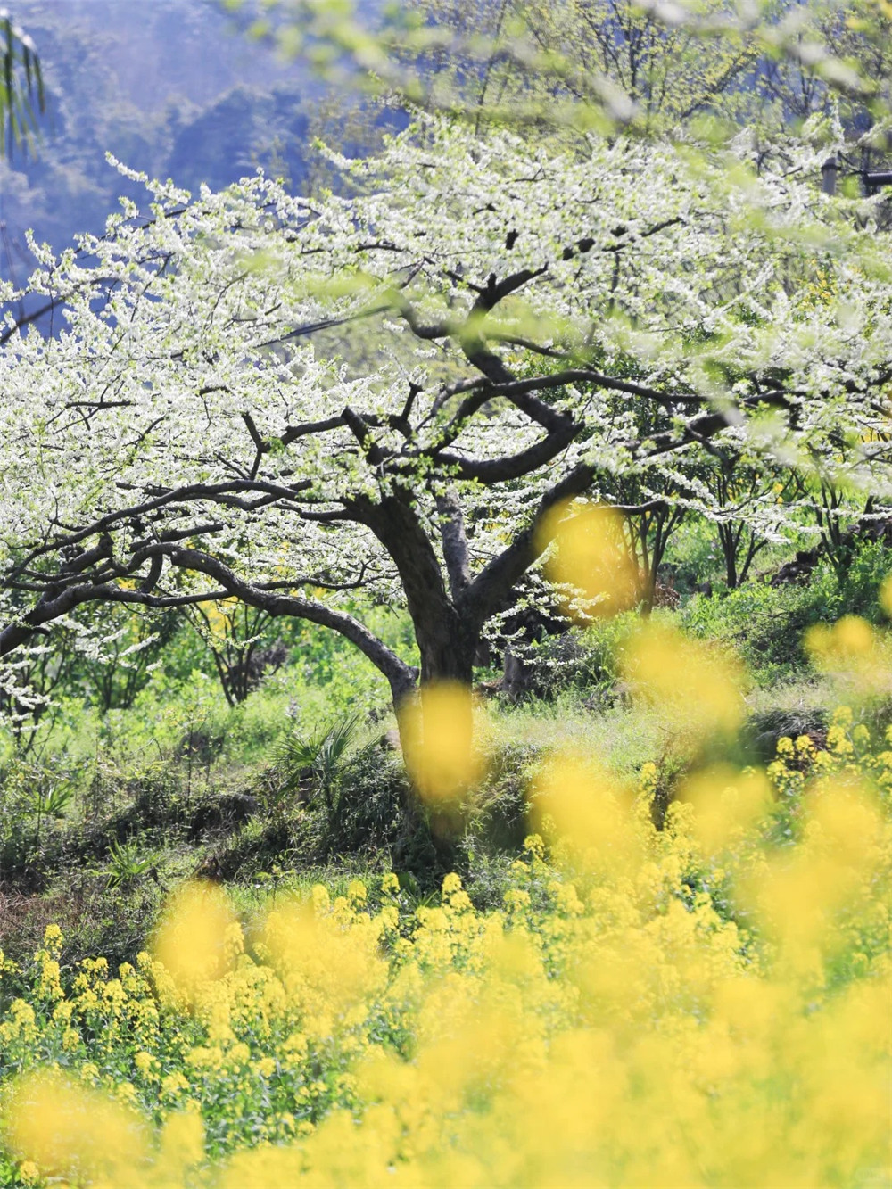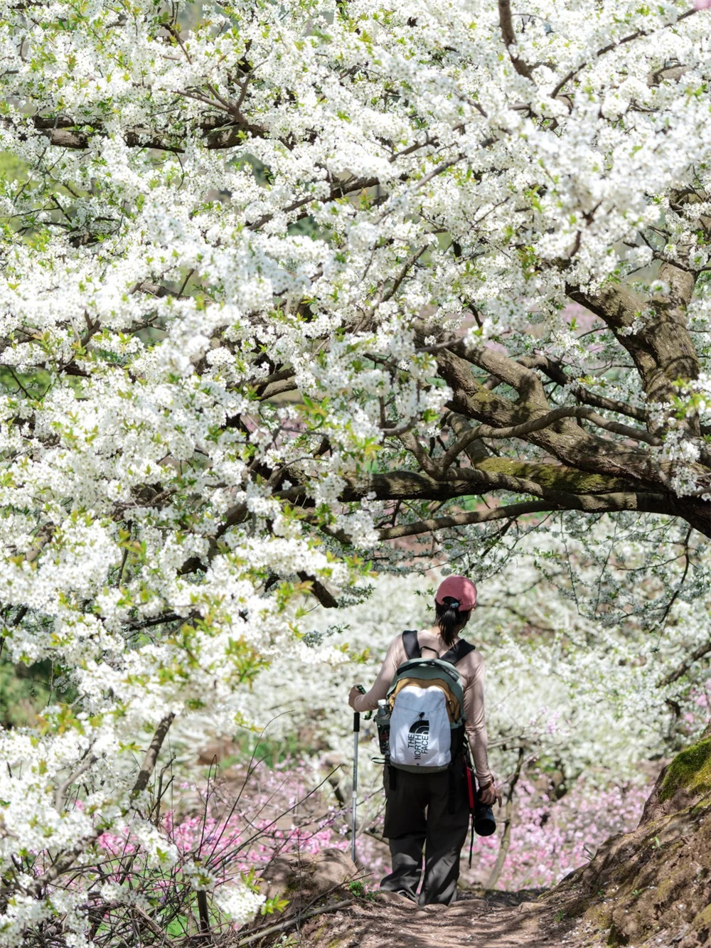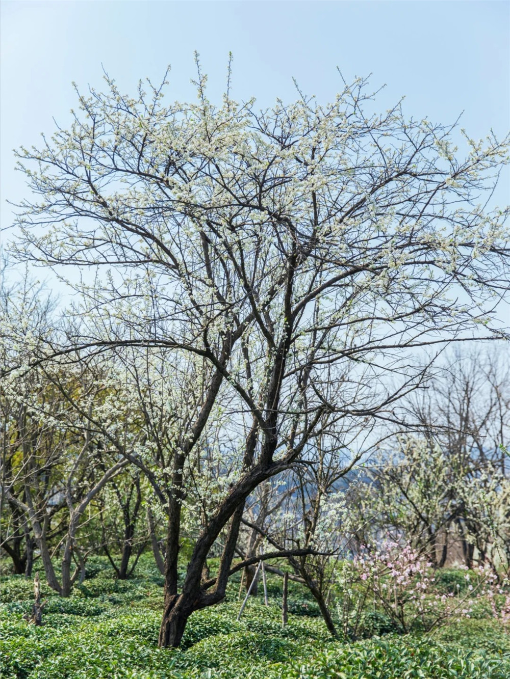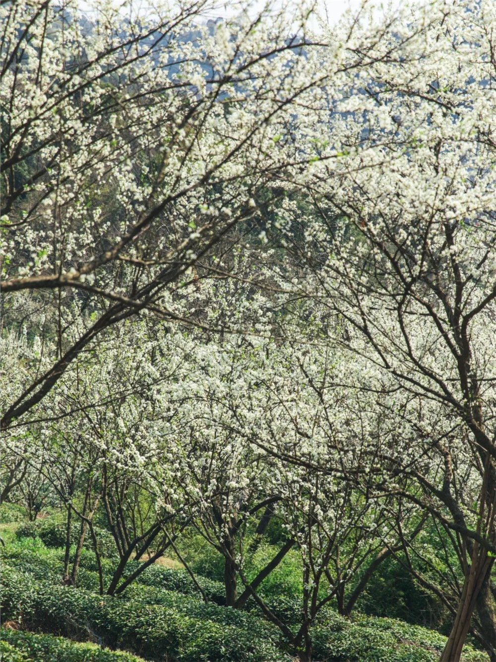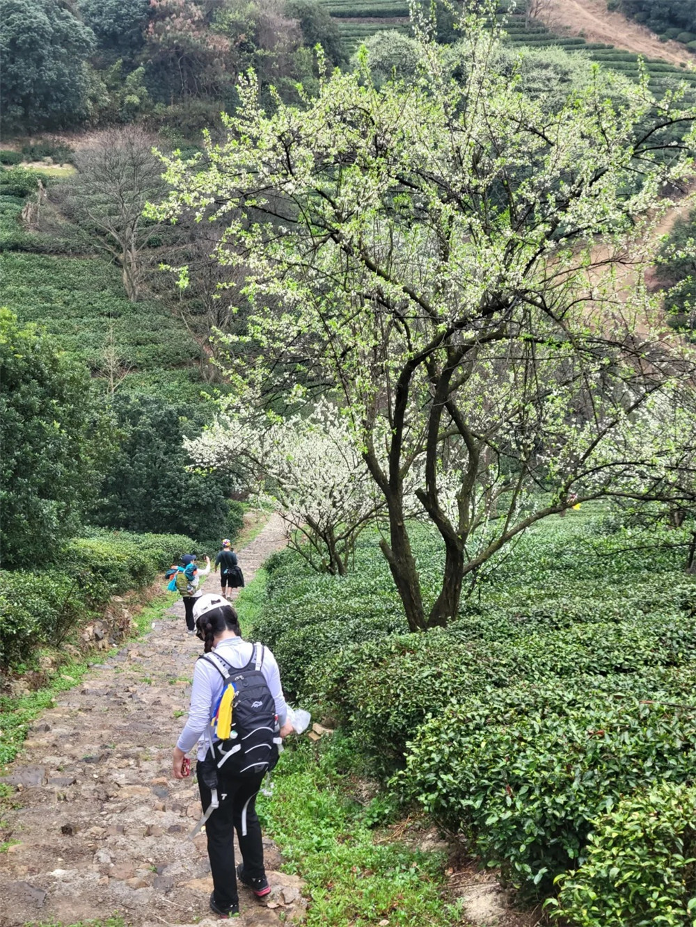 13:00左右,我们沿着山脊继续上山,很快登顶远眺,田地间种满了李花,景色无限。李树的白花香与清明前的嫩茶芽儿香交织一起,相互映衬,那种景象真是令人沉醉。