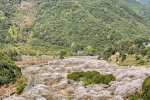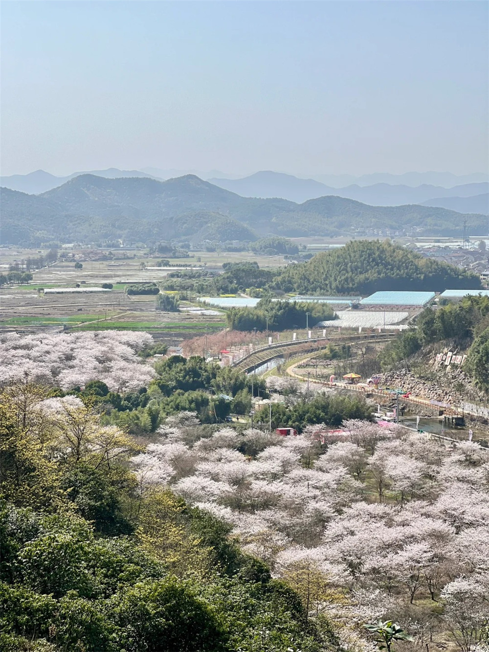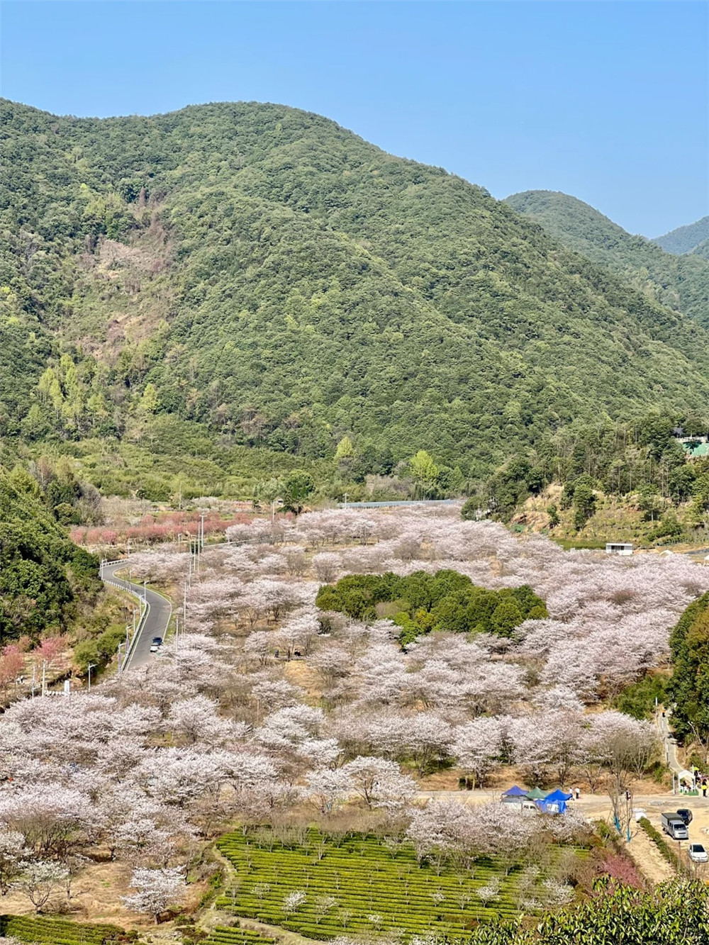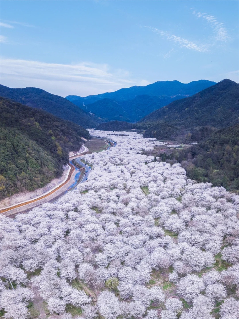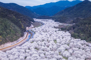 樱花沿溪涧、梯田、山谷绵延
