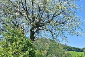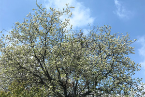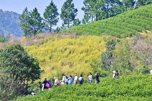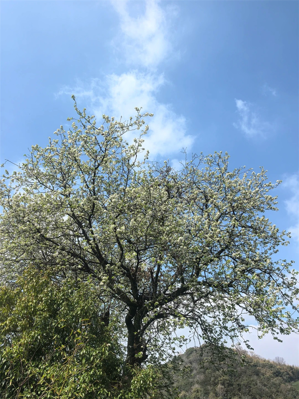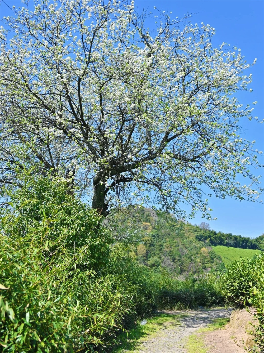 满树洁白梨花与青翠茶树相映,成为独特打卡点